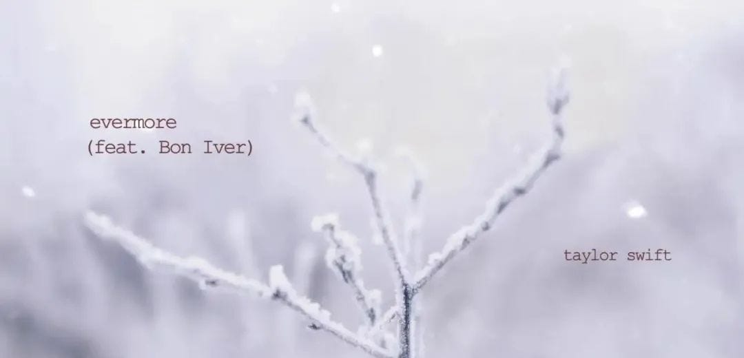 今天本来是打算写 Taylor Swift 的《RED》的,我标题都想好了,这几天一直都在唱《RED》的歌。但当我提起笔的时候,我发现我的心境无法让我对《RED》有更多的书写,反倒是想起了《evermore》。这段感情的开端有些神奇,我当时正在知乎上写作 Bon Iver,突然 Taylor 又空降了一张专辑,我发了条想法。当时我的头像还是 Frank Ocean。几天后,正好是 Taylor 的生日,醒来看手机,发现有人私信我,跟我聊音乐。不知不觉,一天晚上突然下起了雪,我们并排走在街灯下,对方侧过身来想要亲我,结果我恰好在毫不知情的情况下侧过头,嘴唇就这么碰上了。